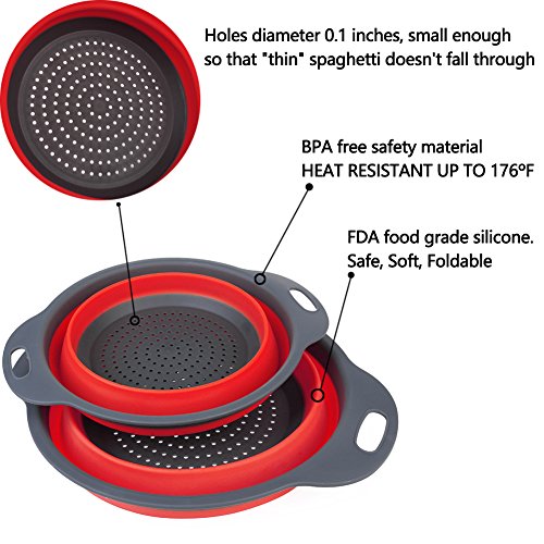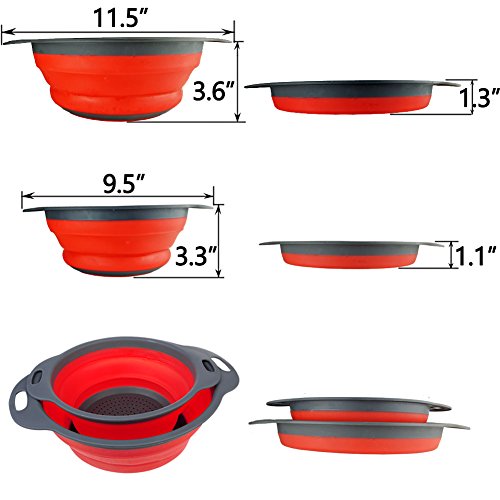 - ➤ SPACE SAVING DESIGN - The two included food strainers are 8 and 9.5 inches in diameter, and these colanders collapse to less than 2 inches high