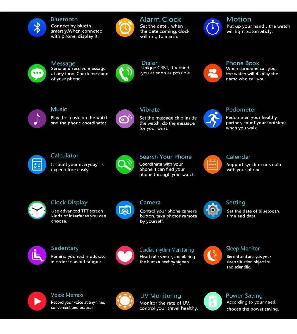Function:Answer Call,Week,Dial Call,Interactive Music,Alarm Clock,Push Message,Passometer,Message Reminder,Mood Tracker,Sleep Tracker,Fitness Tracker