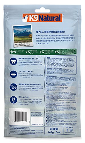 原材料:子羊肉(人間食用の家畜から生産される)、レバー(子羊)、心臓(子羊)、グリーントライプ(子羊)、血(子羊)、卵、脾臓(子羊)、腎臓(子羊)、骨(子羊)、ひまわり油、フラックスシードフレーク、昆布、ニュージーランド緑イ貝、かぼちゃ、ブロッコリー、カリフラワー、キャベツ、硫酸カリウム、乾燥昆布、りんご、洋なし、塩化ナトリウム、ビタミンE、プロティネイト亜鉛、プロティネイト鉄、酸化マグネシウム、セレン酵母、プロティネイト銅、プロティネイトマンガン、ベータカロチン、ビタミンB1、ビタミンD3