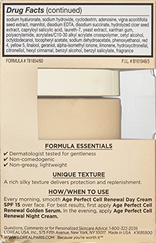 -. Binding : Health and Beauty -. Brand : L'Oreal Paris -. Color : Day SPF 15 Cream -. EAN : 0885552331020 -. Feature : Day cream speeds surface skin cell renewal for fresher, more youthful looking skin / Formulated with LHA to help stimulate surface skin cell renewal and Natecium DHC, a powerful anti-oxidant, to help protect from free radicals / Instantly skin feels smoother, more supple and in 1 month skin appears renewed, vibrant and full of life / Dermatologist tested for gentleness, non-comedogenic, non-greasy, lightweight / Broad Spectrum SPF 15 Sunscreen helps prevent sunburn -. Label : L'Oreal Paris -. Manufacturer : L'Oreal Paris -. Model : Day Cream Moisturizer 1.7 oz -. MPN : K1695500 -. NumberOfItems : 1 -. PackageQuantity : 1 -. PartNumber : K1695500 -. ProductGroup : Beauty -. ProductTypeName : BEAUTY -. PublicationDate : 2014-08-02 -. Publisher : L'Oreal Paris -. ReleaseDate : 2014-06-01 -. Size : 1.7 OZ -. Studio : L'Oreal Paris -. Title : L'Oreal Paris Age Perfect Cell Renewal Day SPF 15 Cream, 1.7 Ounce -. UPC : 885552331020