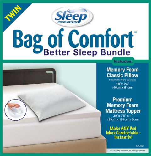 -. Binding : Misc. -. Brand : Sleep Innovations -. Label : Sleep Innovations Inc. -. Manufacturer : Sleep Innovations Inc. -. Model : F-TWP-12840-TX-WHT-PARENT -. ProductGroup : Home -. ProductTypeName : HOME -. Publisher : Sleep Innovations Inc. -. Size : Twin -. Studio : Sleep Innovations Inc. -. Title : Sleep Innovations Bag of Comfort Memory Foam Topper and Pillow Set