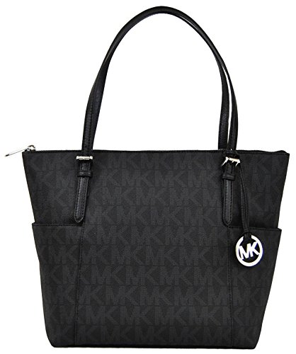 -. Brand : MICHAEL Michael Kors -. Color : Black -. Department : womens -. EAN : 0614409363439 -. Feature : zipper closure Black MK signature logo patterned PVC with black leather trim and silver tone hardware / Lined interior with zippered pocket and 4 open slip pockets / Zippered top closure; side gusset pockets / Dual leather straps with a drop of about 8" / Measures approximately 11" (L) at the bottom tapering to 15" (L) at the top x 11.5" (H) x 4" (W) -. ProductGroup : Shoes -. ProductTypeName : HANDBAG -. Title : Michael Kors Jet Set Item East West Signature Top Zip Black PVC Tote with Silver Tone Hardware -. UPC : 614409363439