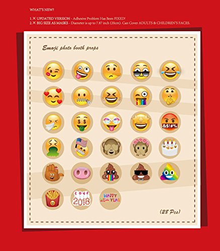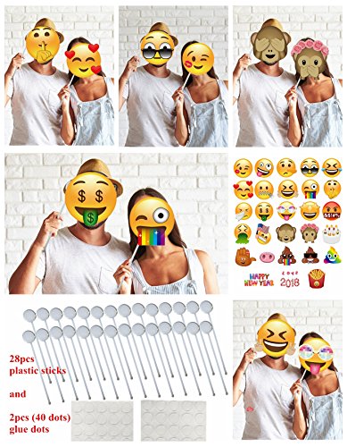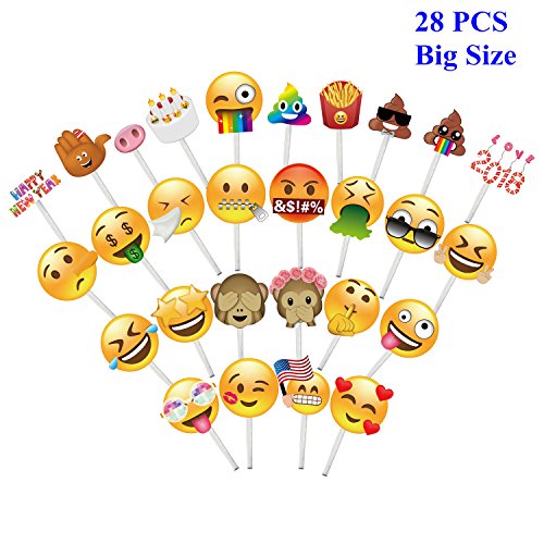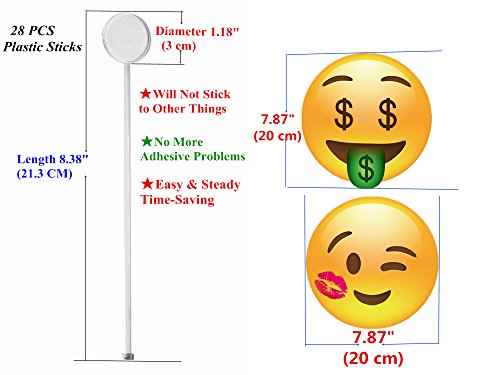 - ★LARGE QUANTITIES of EMOJI PHOTO BOOTH PROPS - 28 Pieces photo booth props with the NEWEST UPDATED FUNNY emoji faces, included 28 PLASTIC STICKS (muddlers), each is 8.38 inch long, 1.18 inch wide round head