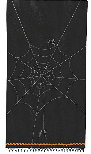 - Features a silvery embroidered spider webs, an orange ribbon and black beaded tassels.