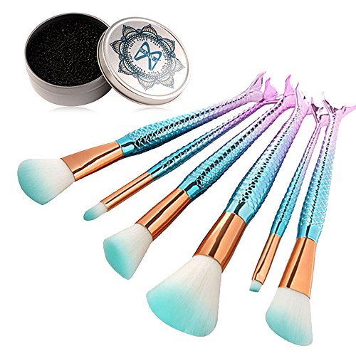 -. Title : Iskas 6pcs Mermaid Makeup Brush Set with Color Removal Sponge Scrubber, Soft Nylon Bristles Make Up Brushes Kit Face Eye Lip Foundation Concealer Blush Contour Cosmetic Beauty Tools