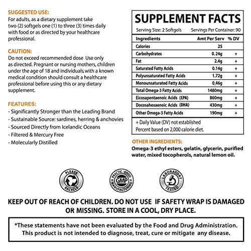 Omega 3 Fish Oil Supplement - Triple Strength EPA 860mg + DHA 430mg - Burpless with Lemon Flavor - Easy to Swallow - Mercury Free - Top Joint, Heart and...