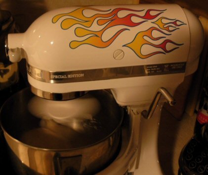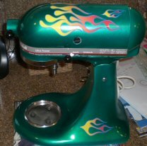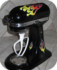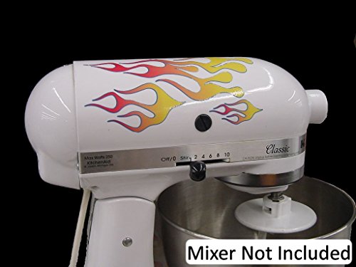 With Hot Rod flames on your mixer, it gets tons of attention like your mixer should! Notice the nice color bleed, the pin stripping, and smell of envy it creates! Actual color bleeds and pin striping will be similar, but each is one of a kind due to printing variations. The decal flames that are separate pieces can be cut apart and placed on other parts of the mixer, like the sides, to give a real customized look to your mixer. Beware of cheap imitations. Cheaper prices mean cheaper vinyl (if vinyl at all), uncut flames, cheaper ink, and GREAT UNHAPPINESS. This vinyl is meant to last 5 years outdoors(!) so it will last in your kitchen as long as your mixer does. Basic installation instructions, cleaning pad, and trouble shooting guide included FREE with order. Please do not use harsh chemicals like 409 as it may damage the graphics. For added protection a layer of shellac (which is always food grade) is acceptable. Installation is easy. Clean with heavy soap and rinse all residue off. Mark the location. Take off the sticky paper, press the sticker on your mixer, remove the protective top paper. Anyone can do it and it makes a GREAT GIFT! The kit won't interfere with your accessories, the Pasta Maker, Food Grinder, Juicer, Can Opener, Ice Cream Maker, Sausage Stuffer, Slicer Shredder, Grain Mill, extra bowl, or pouring shield. Note also if you send your mixer back to KitchenAid under warranty, so go your flames. This product is has no affiliation or endorsement by KitchenAid. The MFG is a third party vendor who likes and uses their products but improves on their color scheme. Product includes the 6 various sized decals on one sheet, instructions, and cleaning pad. XXXXXXXXImperial Grey/Black mixers require spray glue, not included.