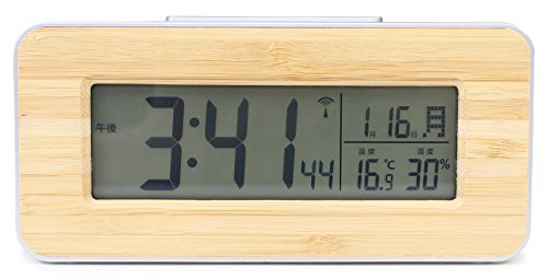 -. Feature : サイズ:(約)高さ7.0×幅15.0×奥行き4.0cm / 材質:ABS樹脂、竹 / 生産国:中国 / 機能:電波受信機能(自動受信、手動受信)、電子音アラーム、スヌーズ機能、温度表示、湿度表示、バックライト(オレンジ)、カレンダー / 電源:単3型乾電池×2本 / 付属品:取扱説明書兼保証書、単3型乾電池×2本