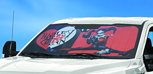 The Plasticolor Warner Bros. Harley Quinn Heart Accordion Sunshade protects your vehicle's interior while making a fashion statement.