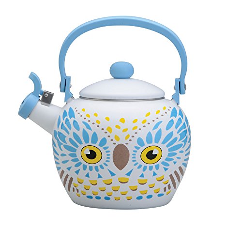 Enamel Whistling Tea Kettle has a pretty blue and yellow owl design