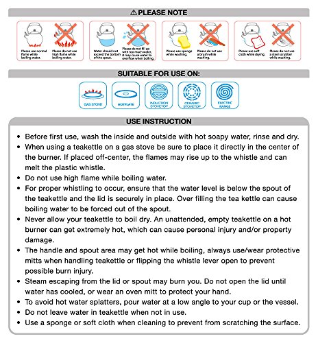 This tea kettle will add fun to your kitchen and bring a smile to your face every time you boil water. These kettles are made of enamel on steel both inside and out and the handle, spout and lid knob are made of durable plastic. 2.1 Quart Capacity. Hand Washing is recommended.