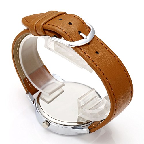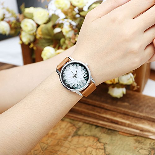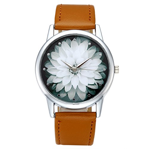 Top Plaza Black and White Lotus Flower Elegant Women Fashion Brown PU Leather Band Analog Quartz Wrist Watch-Brown