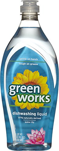 Green Works Dishwashing Liquid, Water Lily, combines powerful cleaning performance with 97% naturally derived and plant-based ingredients to fight tough greasy messes and yet be gentle on your hands. The powerful cleaning formula, with a pleasant Water Lily, scent cuts through tough greasy baked-on food, leaving nothing but a natural, streak-free shine. Greasy messes and splatters easily rinse away without any harsh chemical residue on your dishes. Dermatologist-tested, this dishwashing soap is gentle on your hands while washing even the dirtiest pots and dishes. With Green Works naturally derived cleaning products, you get powerful cleaning done naturally.