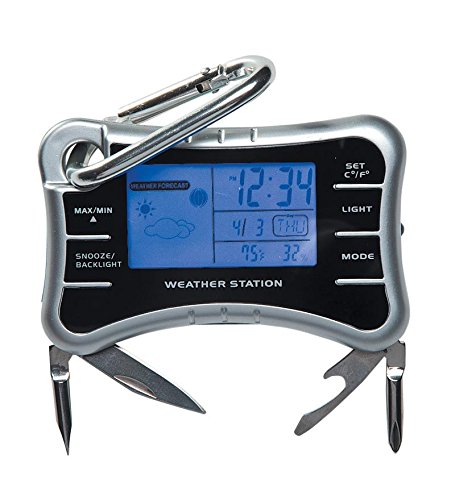 -. Feature : 8-In-1 pocket weather station / Includes weather forecast, alarm clock / Pocket Knife, can and bottle opener / LED flashlight and compass / Size: 3-1/2''w x 2-1/2''H