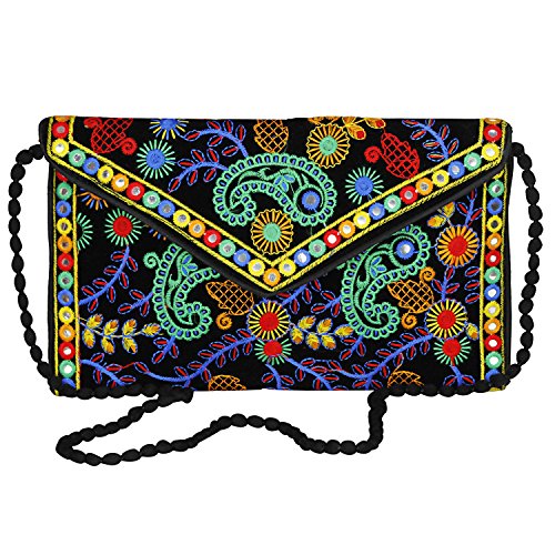 -. Title : Evergreen Handmade Embroidered Banjara foldover Clutch Purse-Sling Bag-Cross Body Bag (Black & Mulicolored)