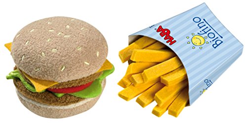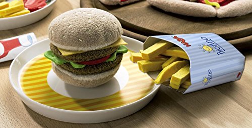 Includes 1 magnetic sesame bun, two hamburger patties, slice of cheese, lettuce, tomato and one serving of french fries.