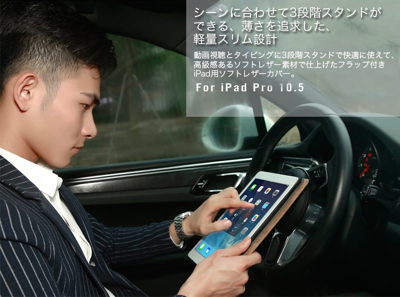 ★「対応機種」新型 iPad Pro 10.5インチ(新しいアイパッド プロ 10.5インチ)★「カラー」ピンク、ブラウン、ブルー(青)、グレー(灰)★「商品特徴」動画視聴とタイピングに3段階スタンドで快適に使えて、高級感あるソフトレザー素材で仕上げたフラップ付きiPad用ソフトレザーカバー。未使用時に液晶画面部分をカバーするフラップが付いています。フラップを閉じるとスリープモードになり、開けるとスリープから複帰します。★「キーワード」新型iPadPro 10.5インチ ケース 手帳型 おしゃれ 耐衝撃 カバー オシャレ レザー素材 本革調 軽量 薄型 アイパッドケース 放熱性の良い上質な素材