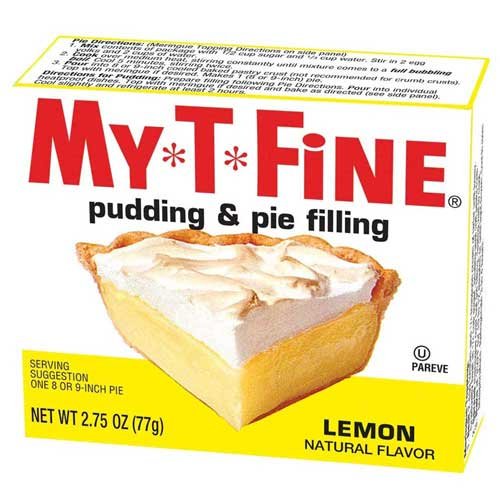 -. Binding : Grocery -. Brand : My-T-Fine -. EAN : 0072392330126 -. Feature : Pack of twelve, 2.75 ounce unit (total of 33 ounce) / Natural flavor / Certified Kosher -. Label : The Jel Sert Company -. Manufacturer : The Jel Sert Company -. Model : 33036 -. NumberOfItems : 12 -. PackageQuantity : 12 -. ProductGroup : Grocery -. ProductTypeName : GROCERY -. PublicationDate : 2011-09-08 -. Publisher : The Jel Sert Company -. Size : 2.75oz -. Studio : The Jel Sert Company -. Title : My T Fine Pudding, Lemon, 2.75-Ounce (Pack of 12) -. UPC : 072392330126