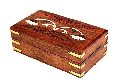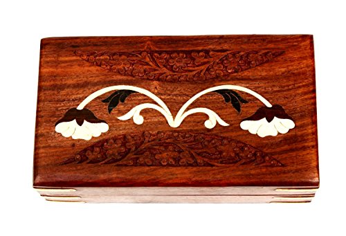 -. Feature : Dimensions: Length - 6.5 inches x Width - 4 inches x Height - 2.5 inches. / Store your personal jewelry or family heirlooms in royal style with this box, also can be used to keep precious stones, pearls, herbs, big tarot cards, Feng shui items, tools and many more. / Handcrafted using one of the finest richly hued timber Rosewood and further adorned with floral patterns. / Box is internally lined with velvet to ensure its contents remain safe and scratchfree. / Handmade by skilled artisans from Saharanpur - India's largest hub for high quality wooden artifacts.
