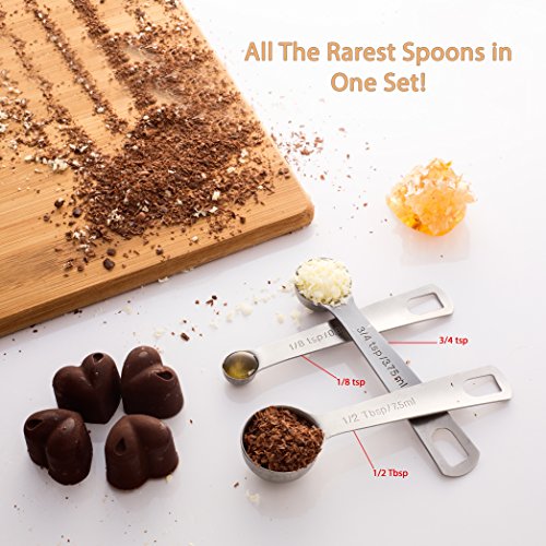 - Palada Stainless-Steel Measuring Spoon Set includes 7 measuring sizes in both measuring standards (Tbsp/tsp and ml): 1/8-tsp (0.63ML), 1/4-tsp (1.25ML), 1/2-tsp (2.5ML), 3/4-tsp (3.75ML),1-tsp (5ML), 1/2-Tbsp (7.5ML) and 1-Tbsp (15ML). All spoon sizes are included in one set. You can easily measure dry and liquid ingredients such as spice, sugar, salt, oil, coffee, wheat. Now baking and cooking is a dream.