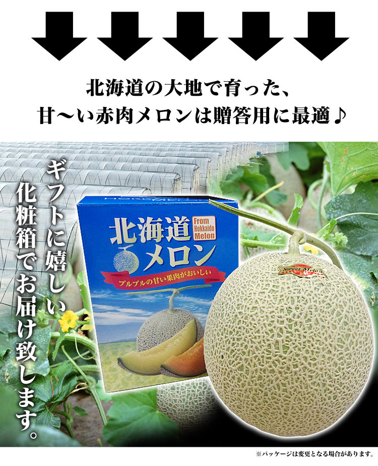 北海道赤肉スイートメロン■原産地:北海道産■内容量:2玉(1玉あたり:約1.3kg~約1.6kg前後)■保存方法届いたらすぐに箱から出し、タッパーからも取り出して下さい。※メロンのガスが充満し品質劣化の原因となります■お召し上がり方:メロンの底を押上げて弾力を感じたら食べ頃です冷蔵庫で冷やして召し上がり下さい■人数の目安:約2~6人前■発送形態:常温・冷蔵発送※気温の暑さによって常温or冷蔵でお届けします。■同『赤肉スウィートメロン』商品同士のみ同梱可能■発送予定:7月下旬または8月中旬前後頃から順次■到着日指定不可めろん お中元 内祝い 暑中見舞い 御礼 お礼 誕生日 ゴルフコンペ 贈答 贈り物 ギフト 爆買い 北海道直送