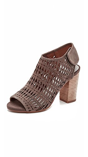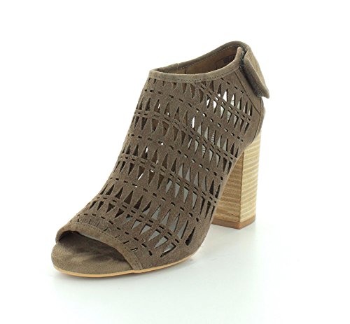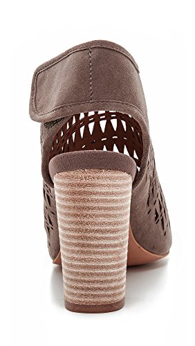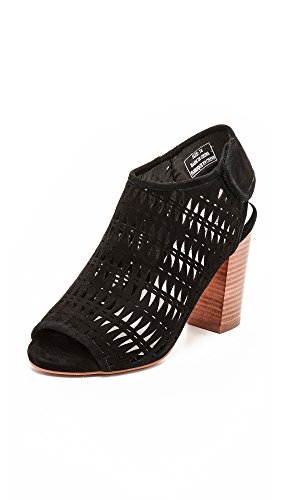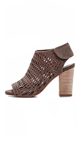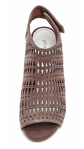 Laser-cut designs lend a graphic element to these supple suede Jeffrey Campbell booties. Open toe and cutout heel. Velcro® closure. Stacked heel and rubber sole.