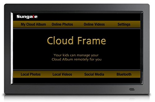 -. Binding : Electronics -. Brand : Sungale -. Color : Black -. EAN : 0884945002424 -. Feature : Receive real-time photos from cell phones from different different cities or countries / Enjoy free cloud storage space where you can store your photos and other files / Compatible with social media including Facebook, Twitter, Instagram, Google+ and others / Watch movies from Netflix and other video hubs / Built-in Drop Box to receive photos automatically from your cell phone -. Label : Sungale Group Inc. -. Manufacturer : Sungale Group Inc. -. Model : CPF1510+ -. MPN : CPF1510+ -. PackageQuantity : 1 -. PartNumber : CPF1510+ -. ProductGroup : Photography -. ProductTypeName : CAMERA_OTHER_ACCESSORIES -. Publisher : Sungale Group Inc. -. Size : 9.00 x 1.30 x 14.00 -. Studio : Sungale Group Inc. -. Title : 14" Smart WiFi Cloud Digital Photo Frame, free Cloud storage, real-time photos, Movie, Social Media, Browser, all apps -. UPC : 884945002424