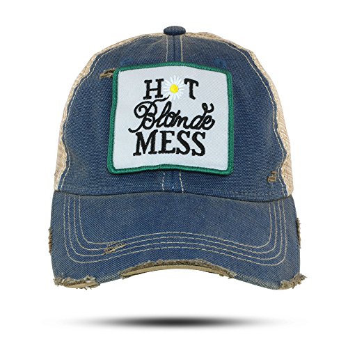 Binding : Apparel Product Description Shabby, Chic, Vintage Distressed Trucker Cap! Just take pride in your Blonde hair you will love this Cap! You know your hot, let everyone else recognize it as well! This adorable Blue Hot Blonde Mess Trucker Hat is made with 65% polyester mesh backing and 35% cotton. There is a pleasant buttery soft mesh backing. And it has an adjustable strap on the back and when we say soft we mean it. This cap is the perfect style for all the women. And moms out there with love it! This hat features a Hot Blonde Mess patch with daisy in a gorgeous vintage material. This wonderful cap is the perfect gift for women, or a great gift idea for friend. Imagine the excite she will have once you show her this charming gift idea. Perfect for days spent in class, or at a BBQ. Fun to wear for those game days! It's charming for tailgating, and wonderful for those bad hair days too! You will love this Hot Blonde Mess Vintage Distressed Trucker Hat! Also check it out in Black,Red or Camo colored hat! One of the things we love is the adorable washed look of the color in the cap. And the patch really stands out! This cap is an adorable tailgating hat that people notice and think is charming. People who wear this hat are constantly asked, " Hey where did you get that gorgeous hat?" Get this lovely every day hat now. Enjoy the Georgia Girl Hot Blonde Mess cap all year long! Features of Georgia Girl Hot Blonde Mess vintage trucker baseball cap ?Its is a Vintage Ball Cap in a trucker style. ?It has a Hot Blonde Mess patch on the front. ?It has a buttery soft Mesh backing. ?Adjustable snap strap on back ?Vintage Distressed look ?65% polyester 35% cotton ?One size fits most 0