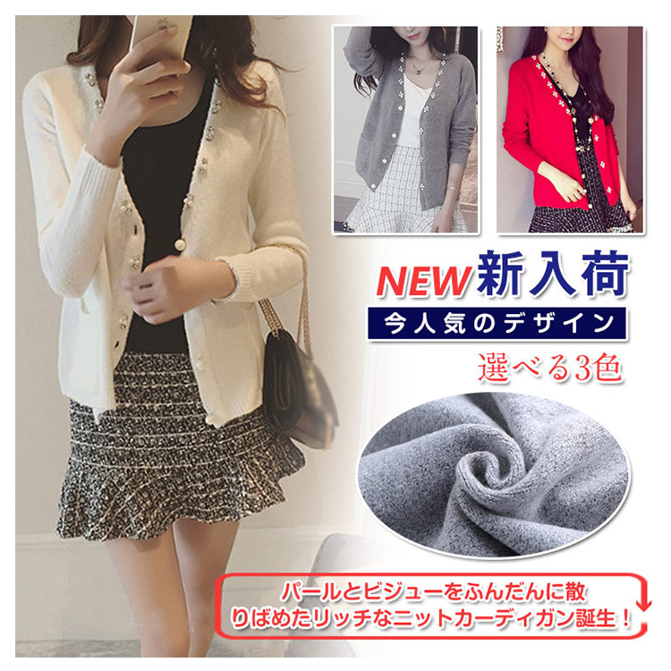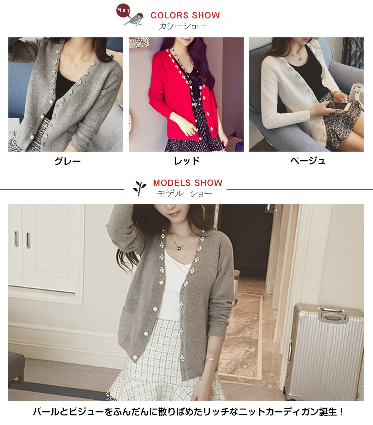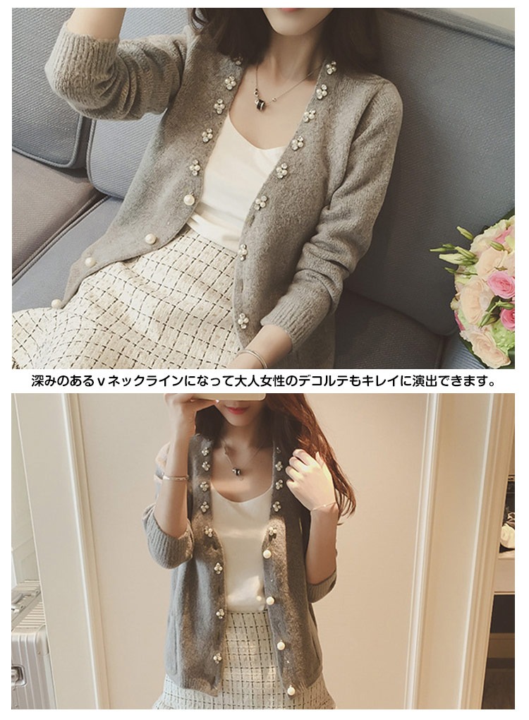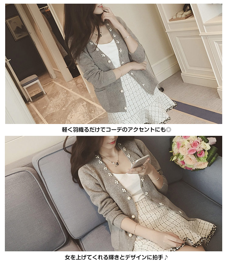 | パールとビジューをふんだんに散りばめたリッチなニットカーディガン誕生!軽く羽織るだけでコーデのアクセントにも◎女を上げてくれる輝きとデザインに拍手♪深みのあるvネックラインになって大人女性のデコルテもキレイに演出できます。肩掛けにしても、羽織っても、TOPS感覚で着用してもOKのお役立ちアイテム♪ | |