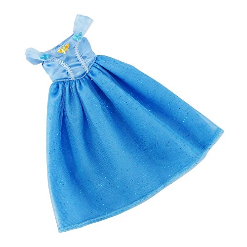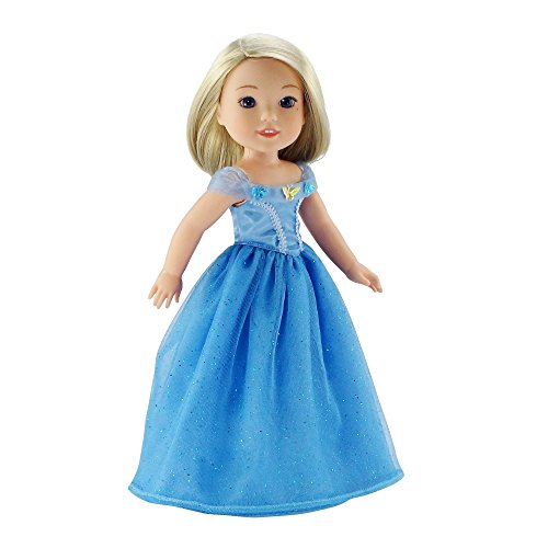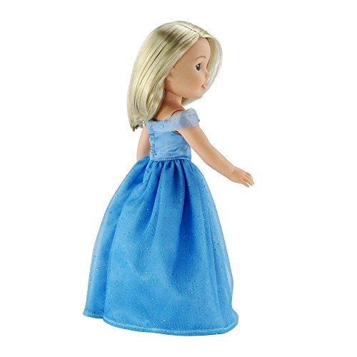 Get ready for the ball before the clock strikes midnight! Dress your 14" doll in this fabulous Cinderella-inspired evening gown. This satin off-the-shoulder dress has exquisite details including scalloped neckline with shimmering blue and yellow butterflies. The blue satin bodice has white lace seam detail and the 2-layer blue tulle with blue glitter accents overlays a blue satin skirt. This lovely gown features our no-grab Velcro back closure making getting dressed a breeze. Enjoy endless hours of fun with this favorite Disney inspired character ball gown. *Doll Not Included*Feature