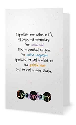 FRIENDSHIP GREETING CARD MESSAGE "I appreciate your outlook on life; it’s simple, yet extraordinary. Your curious mind seeks to understand and grow, your positive perspective appreciates the best in others, and your grateful heart sees the most in every situation. I think this gift reflects your awesome attitude. It is modest and turns an ordinary ensemble into something spectacular."