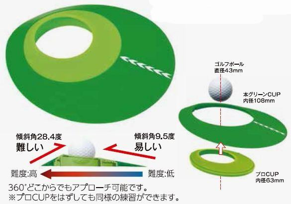 | カップの内径が異なる2つのカップ(本グリーンCUPとプロCUP)を組み合わせたり、カップの向きを変えてアレンジすることで360度変化に富んだパッティング練習をすることができます。 |
