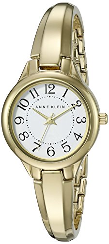 Stainless steel case. Brushed gold-tone metal bracelet features a jewelry clasp closure. Round face. Three-hand analog display with quartz movement. White dial features gold-tone hands, black-tone hour markers, minute track, and Anne Klein detailing. Presentation box included.