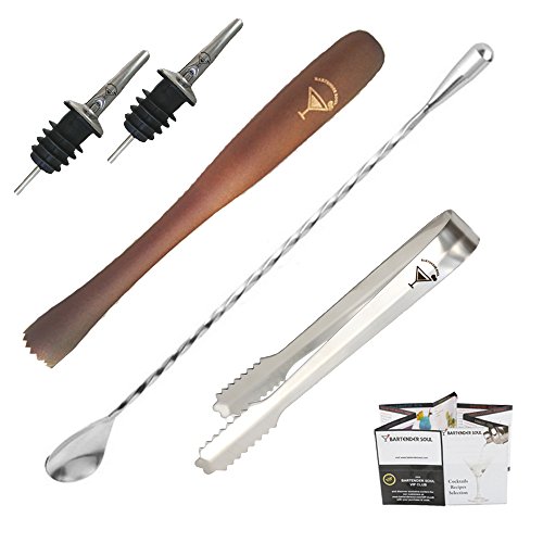 Bartender Soul® Cocktails Essential Tool Set is composed by · Wooden 10' Muddler · Professional Weighted 12' Stirrer spoon · 2 Pourers for Liquor Bottles · Nice Ice Tongs. Get the Essentials Tools to Have in any Cocktails Bar. 0 |