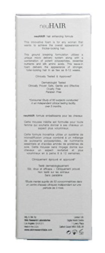An amazing scientific breakthrough formula effectively promotes the appearance of stronger, thicker, fuller-looking hair in as little as 8 weeks. Specifically developed for women to address the lack-luster look of hair caused by stress, diet, aging and every day hair care regimen - styling, curling, straightening, coloring and other treatments that strip hair from its essential moisture. This unique leave-in foam utilizes Active Hair TechnologyTM by encapsulating a powerful blend of polypeptides to help deliver nutrients to the hair and scalp. Biotin (Vitamin B7) and Panthenol (Vitamin B5) help provide nourishment to the scalp and protect hair against brittleness and breakage. Silk Amino Acids from pure silk fibers help moisturize and smooth the hair shaft leaving it soft and supple and making it more resilient. Sweet Almond Extract helps bring back softness and brilliance into the weakened or damaged hair. Make the shiny, voluminous-looking hair of your dreams a reality with clinically-proven results from neuHAIR. How to apply: Massage 4 pumps directly to the scalp once a day, preferably in the evening before bedtime. It is recommended to apply one pump at the crown, one pump at the back of the head and one pump to each side of the head. Can be applied to a towel dried scalp (after washing and conditioning hair as usual) or directly onto a dry scalp. Wash hands with soap and water immediately after use. When used as directed an 80ml container of neuHAIR should last approximately 3 months.