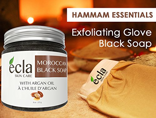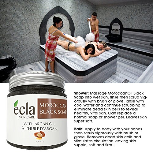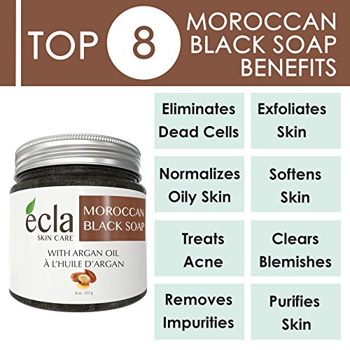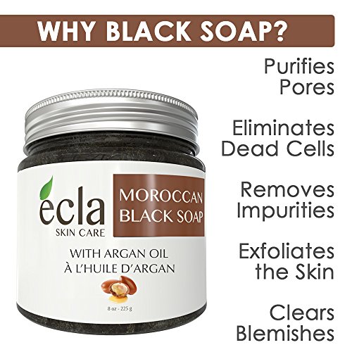 - EXFOLIATE AND DETOXIFY NATURALLY: This rich-in-minerals soap helps clean, exfoliate and detoxify your skin while leaving an extraordinarily smooth and silky finish. Being a 100% natural plant product and being extremely rich in vitamin E, Ecla Skin Care Natural Moroccan Black Soap is the secret to a clean, healthy and radiant skin. it helps to revitalize the skin and improve its elasticity and firmness, acting against dryness, flakiness, dehydration and aging skin.