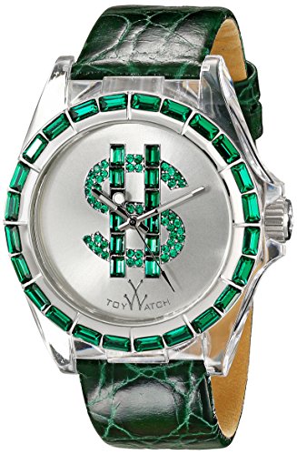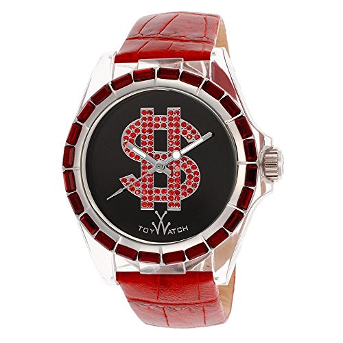 ReleaseDate : 2014-09-30 Studio : Toy Watch Publisher : Toy Watch Binding : Watch Product Description Clear polycarbonate case with a red leather strap. Stainless steel bezel set with red baguette crystal. Black dial with red crystal-set dollar symbol and silver-tone hands. Dial Type: Analog. Luminescent hands. Quartz movement. Scratch resistant synthetic mineral crystal. Screw-down crown. Solid case back. Case diameter: 40 mm. Round case shape. Tang clasp. Water resistant at 30 meters / 100 feet. Functions: hours, minutes, seconds. Casual watch style. Toy Watch Black Dial Red Leather Strap Unisex Watch D10BKR. 0