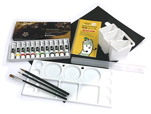 -. Feature : 「和」を感じさせる美しい色調と、「ざらざら」とした質感が特徴のターナーアクリルガッシュ / ジャパネスクカラーシリーズは絵の具の中に細かな粉を混合し独特な『ざらざら』した質感と、『和』を感じさせる色調が特徴です / セット内容:ジャパネスクカラー12色・クリエイトナイロン筆3本セット・三重筆洗・デザインパレット・丸筆筒・ポーチ・混色ノート(アクリルガッシュ版) / セット配色:白/黄蘗色/猩々緋/真朱/浅緑/苔色/淡水色/鉄紺/赤金/銅/黒銀 / 絵具容量:11ml