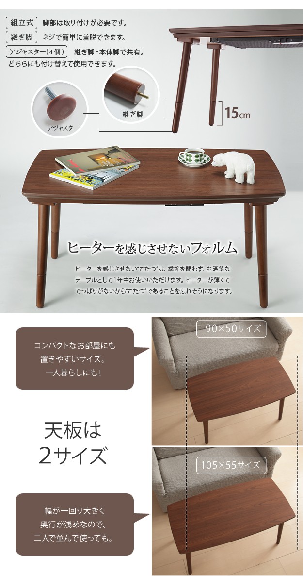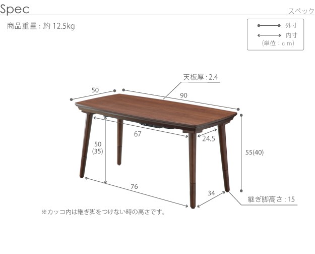 サイズ:幅90x奥行50x高さ55cm(40+継ぎ脚15cm)・約12.5kg