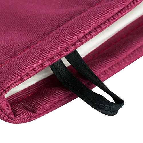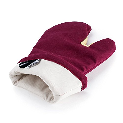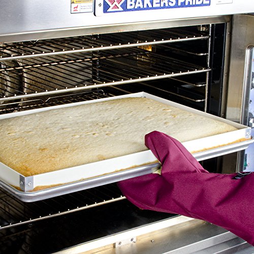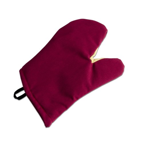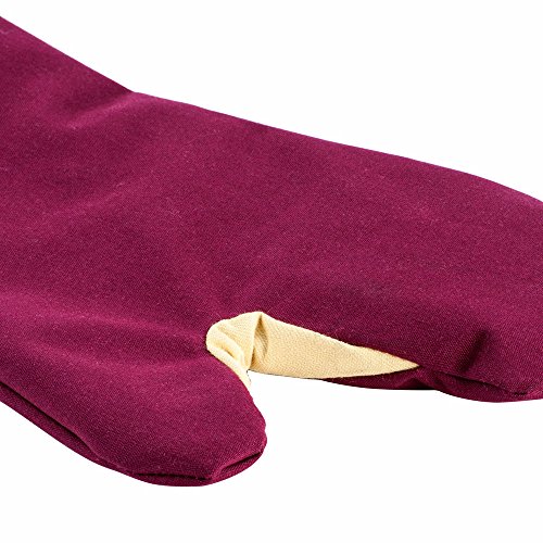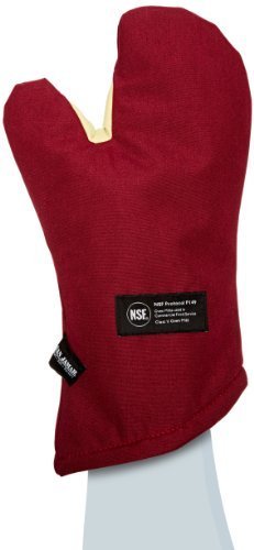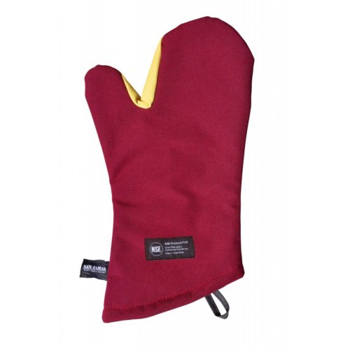 The San Jamar KT0215 Kool-Tek Nomex conventional temperature protection oven mitt is a 15" long, conventional style, machine washable, ambidextrous oven mitt to protect hand and wrist from heat up to 450 degrees F. This mitt meets NSF International (NSF) Protocol P149 for oven mitts used in commercial food service with Class II designation for intermittent flame protection. It has a red Nomex fabric layer for heat and flame resistance, and yellow Kevlar fabric edges for cut, abrasion, and heat resistance.