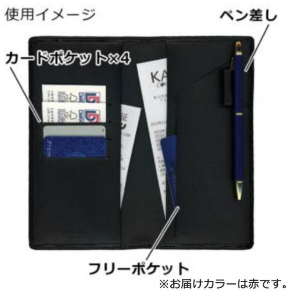 カバーには、やわらかく手になじみやすい革を使用しています。カードポケット、フリーポケット、ペンホルダー付き。