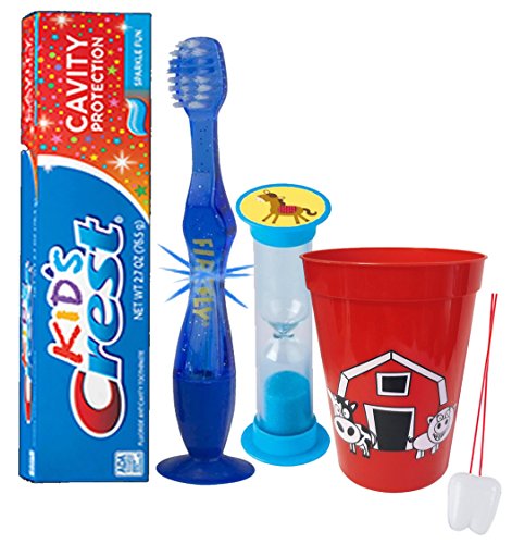 -. Feature : Turn something your kids have to do into something they want to do with the help these barnyard friends..Because when brushing is fun, it gets done! / (1) Firefly Youth Flashing Lights Suction Cup Toothbrush (Assorted Colors) (1) Kids Crest Cavity Protection Sparkle Fun Toothpaste, 2.7 oz / (1) Farm Animal Themed 16oz Plastic Mouthwash Rinse Cup, Doubles As Toothbrush Holder! / (1) Dentist Recommended 2 Minute Farm Animal Themed Brushing Timer (Assorted Styles) / Plus Bonus "Remember to Brush" Visual Aid Tooth Saver Necklace. Hang it in their bathroom or by their bed so they remember to keep their chompers sparkly fresh. You could also use these tooth charms to save one of your child's baby teeth.