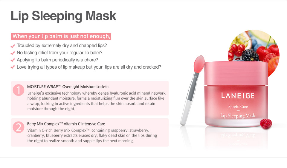 Laneige’s unique Moisture-wrap™ technology uses effective ingredients of hydro ion mineral water contained in a biopolymer mineral network, evening primrose extract, and apricot extract to increase the skin’s absorption and sustaining capabilities while you sleep.