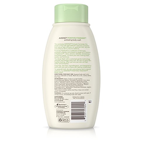 Reveal healthy-looking, more radiant skin with Aveeno Positively Radiant Exfoliating Body Wash. Enriched with Active Naturals Total Soy Complex, this body exfoliator uses cleansing technology to sweep away dull, dry skin. The hypoallergenic, soap-free, and dye-free formula is gentle on skin and leaves it feeling softer, smoother after just one use. Positively Radiant is a collection of skincare products uniquely formulated to target all 5 Factors of Radiance --tone, texture, dullness, blotchiness, and brown spots--to leave your skin looking fresh, awake and luminous.Feature