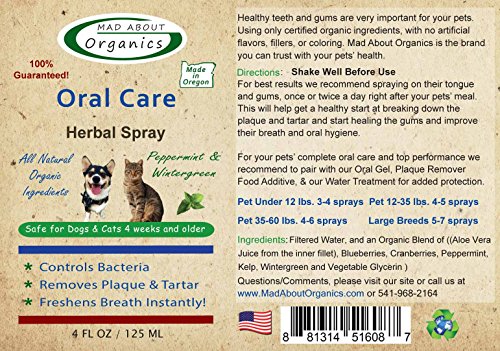 Maintaining healthy teeth and gums is very important for your pet's overall health. Plaque and tartar buildup on the teeth causes inflammation of the gums, allowing harmful bacteria to damage your pet's teeth and also travel in the bloodstream to infect the heart, kidneys and liver. We know that veterinary dental cleanings are not only very expensive, but they put your pet at risk from the anesthesia. That's why we developed our easy-to-use Oral Care Herbal Spray. Simply spray on your pet's tongue and teeth, and allow your pet to lick and spread the product around in their mouth. The spray works to soften existing plaque and tartar, help heal the gums, and freshen your pet's breath. With regular application after a few weeks, existing plaque and tartar build-up will either naturally fall off or you can use a toothbrush to help brush it off. Once removed, continued use of the spray will prevent future plaque and tartar build-up, thus blocking harmful bacteria from causing inflammation of the gums and accessing the bloodstream.Organic Ingredient List:Filtered Water, Organic Blend of (Aloe Vera Juice (from the inner fillet), Blueberries, Cranberries, Peppermint, Kelp, Wintergreen and Vegetable Glycerin)Nestled in the Pacific Northwest in Eugene Oregon, Mad About Organics started in 2007. Our mission is to take a different approach to protect animals from insects organically, eliminating the traditional toxic chemical treatments that can cause major issues in pets.Like you, we only want the best for our animals and have now developed a complete product line consisting of: Flea and Tick, Advanced Dental Care, Healing Skin/Itch Relief, Soothing Shampoos, Healing Ear Cleaner, Healing Salve and our amazing Healing Liniment.Our goal at Mad About Organics is to continue to provide the safest, most natural and effective animal care products for you and the ones you love.Feature