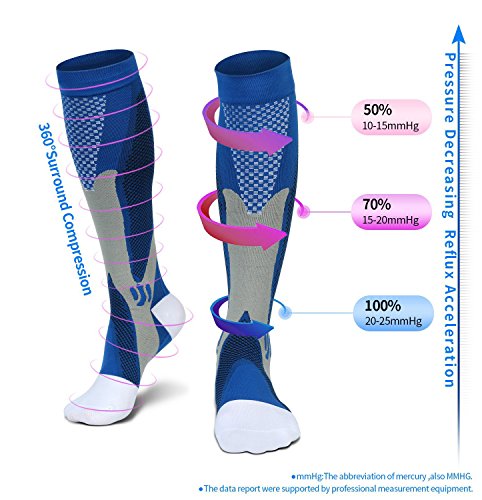 IMPROVED BLOOD CIRCULATION WITH GRADUATED COMPRESSION – Our graduation compression technology (20-30mmHg) provides the ideal compression to provide the maximum boost to your blood circulation. Better oxygen circulation provided by our compression socks helps reduce lactic acid build up and aids muscle recovery in your calf, ankle, feet, and legs. Why let yourself suffer any longer? Let our compression socks help you promote recovery, reduce injury, and feel great again!