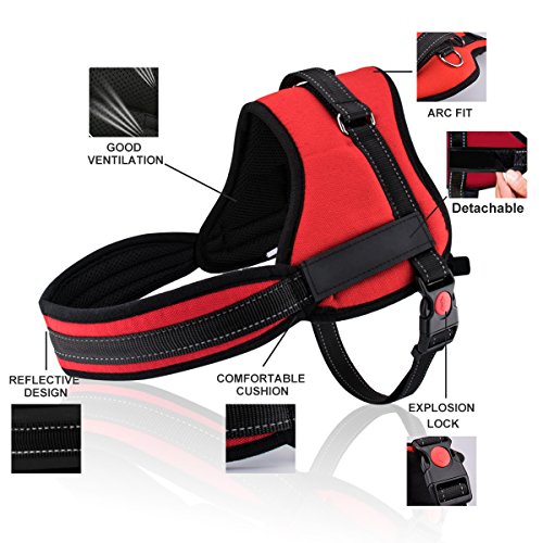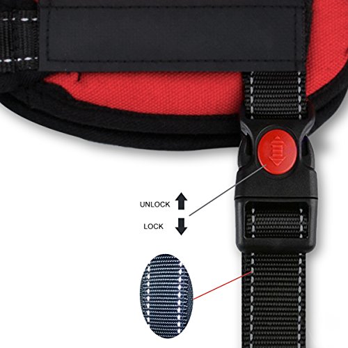 >A safety buckle makes it easy to put on or take off the no pull harness.