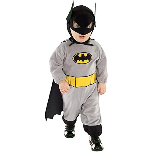 -. Brand : Rubie's -. Color : Black/Grey -. Department : baby-girls -. EAN : 0082686812054 -. Feature : Gray jumpsuit / Snap leg closure / Yellow utility belt embroidered on jumpsuit / Black snap on Batman cape / Black character mask with tie closure -. ProductGroup : Apparel -. ProductTypeName : BABY_COSTUME -. Size : 12 Months -. Title : Infant Baby Boy Batman Halloween Costume (6-12 Months) -. UPC : 082686812054