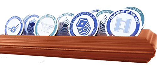 Military Collectible Challenge Coin Holder Rack (Medium, 3 Rows) Solid Walnut coin display holds the standard 18 Coins proudly all your treasured awards and memorabilia.