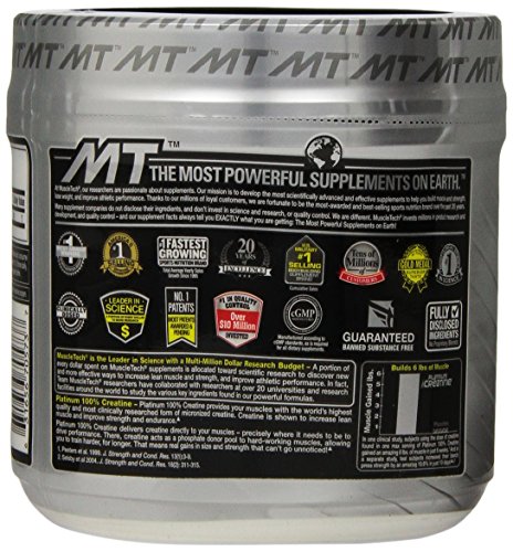 -. Binding : Health and Beauty -. Brand : Unknown -. Feature : 5,000mg Creatine / Builds Lean Muscle / Increases Strength / Ultra pure micronized creatine powder / Delivers a clinically tested HPLC-tested micronized creatine for unparalleled absorption -. Label : MuscleTech -. LegalDisclaimer : Actual product packaging and materials may contain more and different information than what is shown on our website. We recommend that you do not rely solely on the information presented and that you always read labels, warnings, and directions before using or consuming a product. Please see our full disclaimer below. -. Manufacturer : MuscleTech -. ProductGroup : Health and Beauty -. ProductTypeName : HEALTH_PERSONAL_CARE -. Publisher : MuscleTech -. Studio : MuscleTech -. Title : MuscleTech Platinum 100% Creatine
